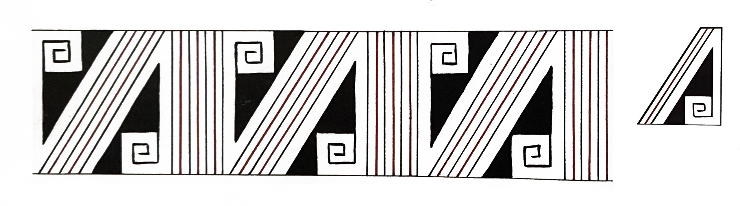 En este diseño se presentan dos bandas oblicuas negras sobre fondo blanco, con una línea roja central, separando las grecas reflejadas.