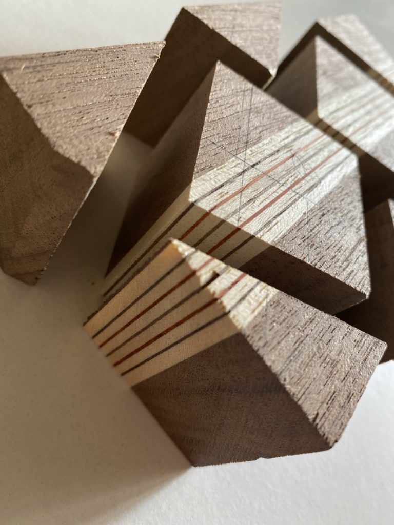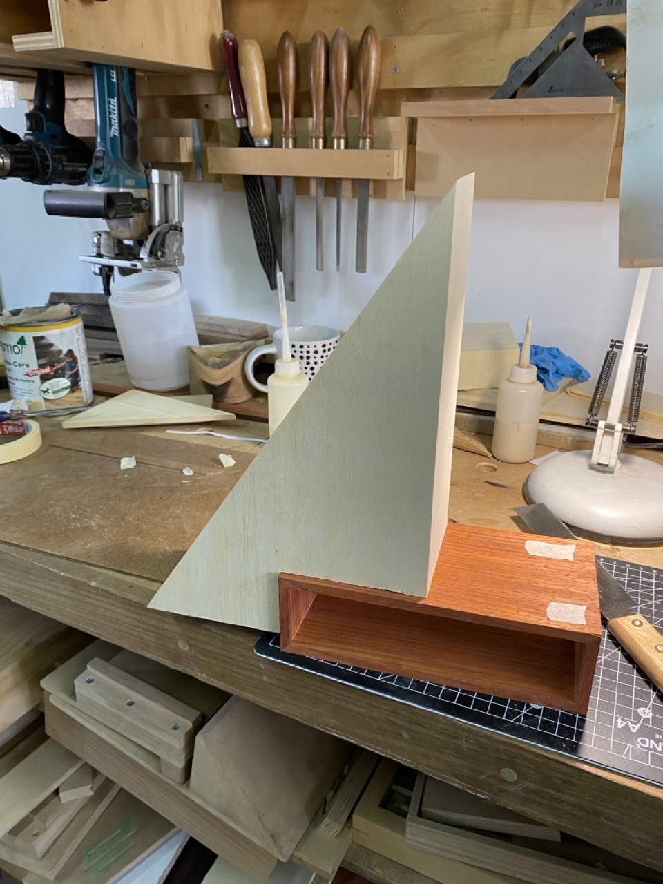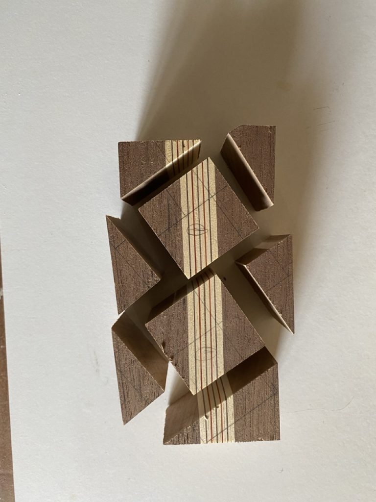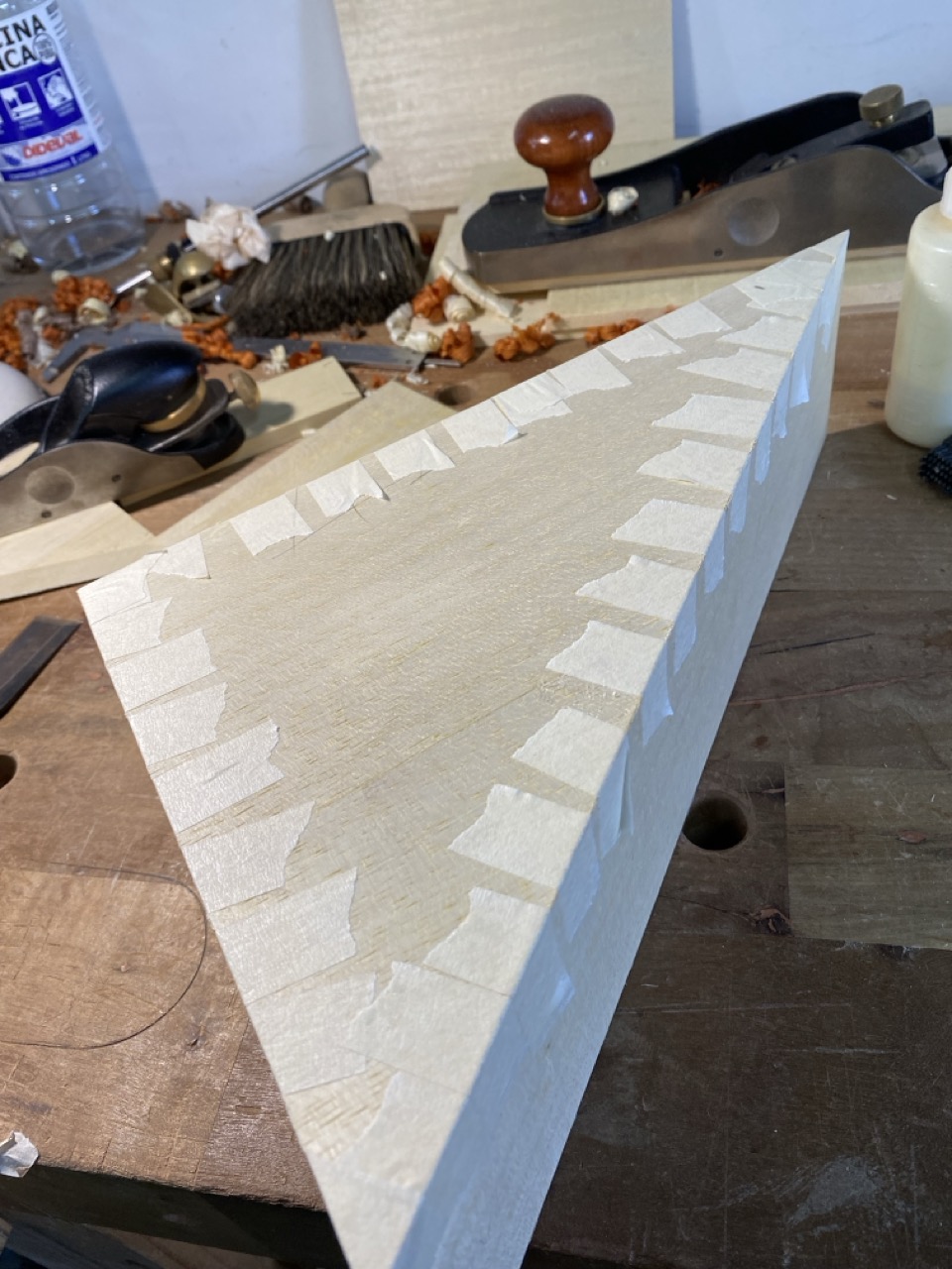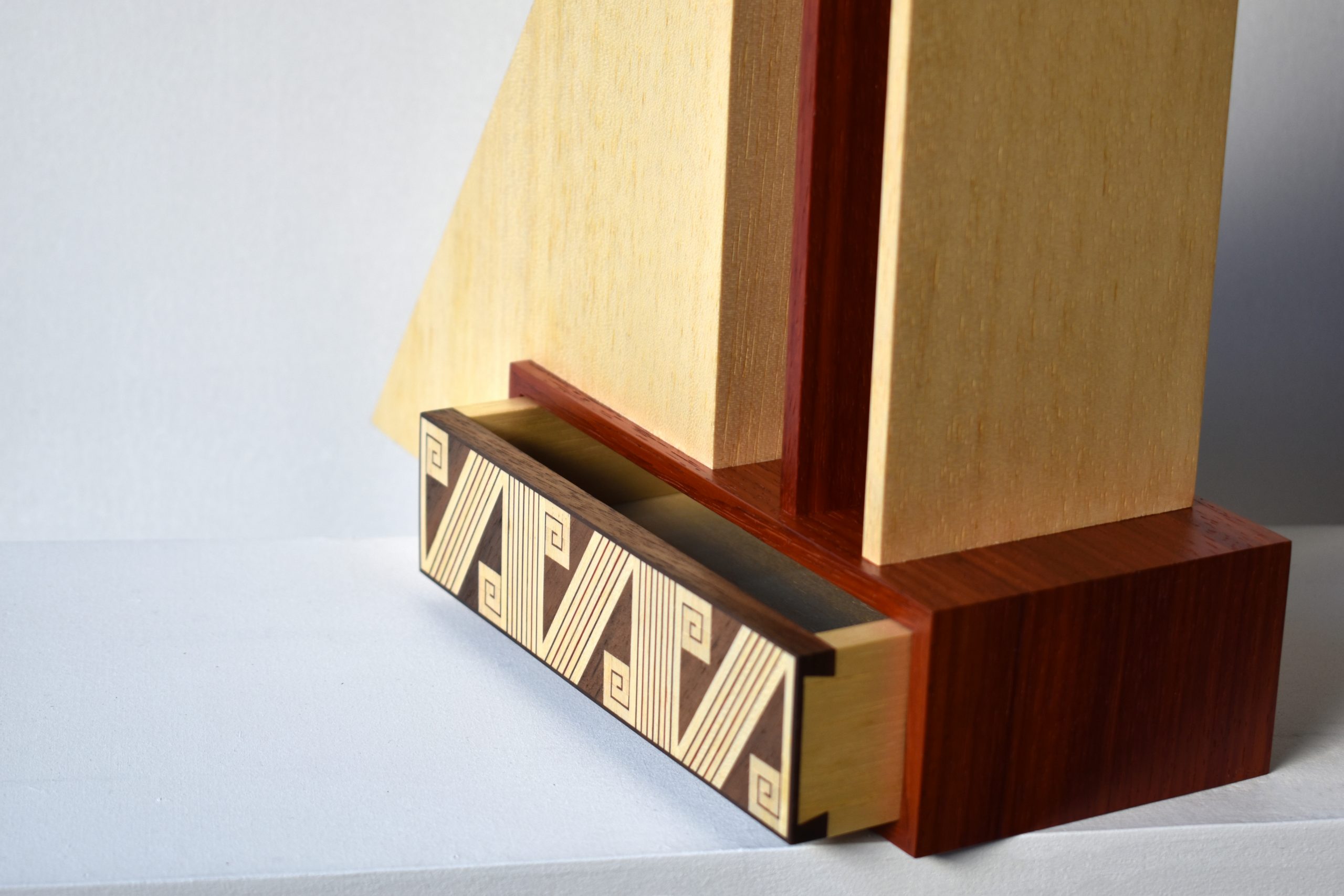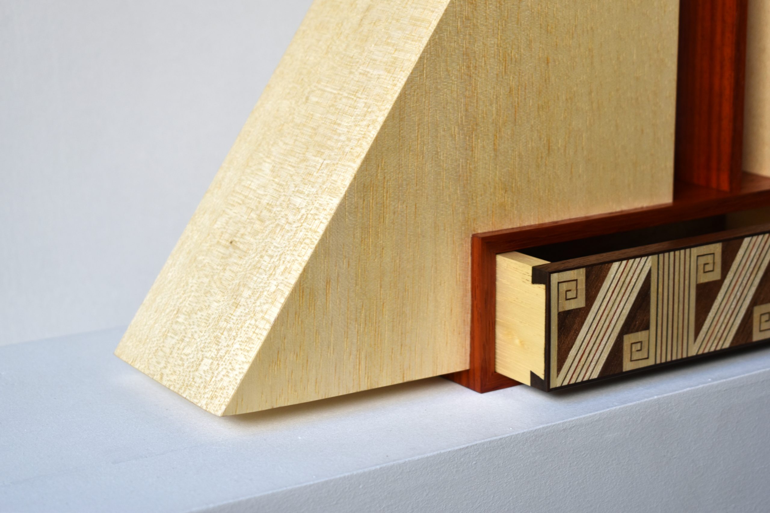 Cuerpo triángulo rectángulo: Uniones en 45º para cerrar el objeto y uniones de caja y espiga para adosarlo al casillero del cajón.