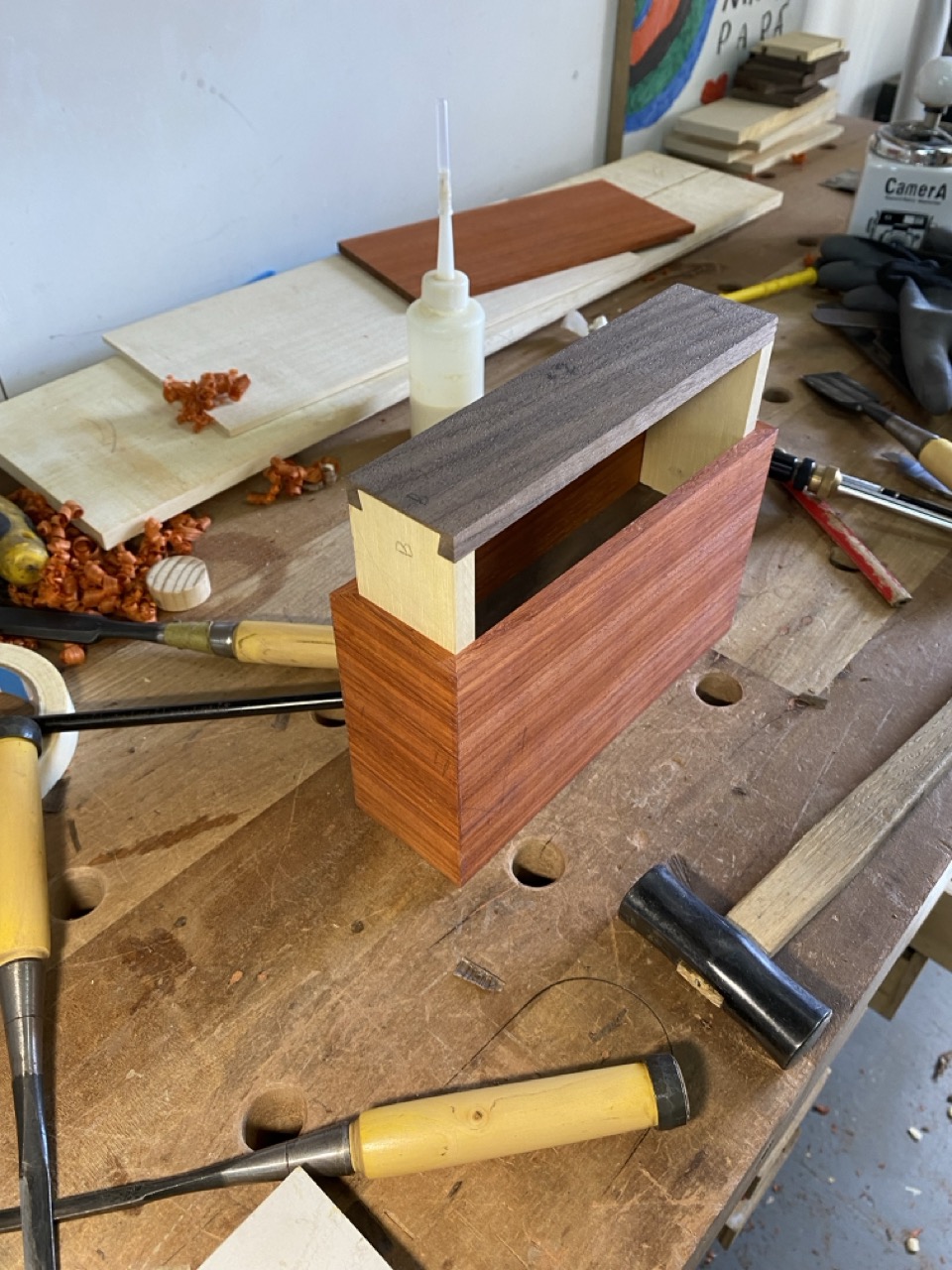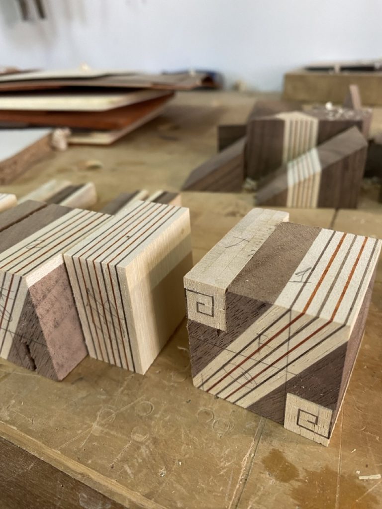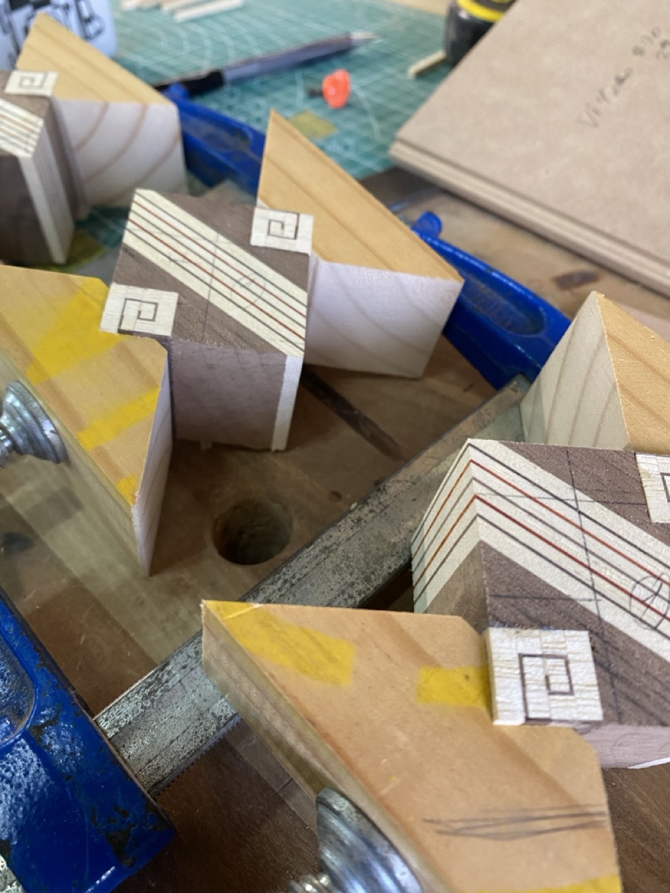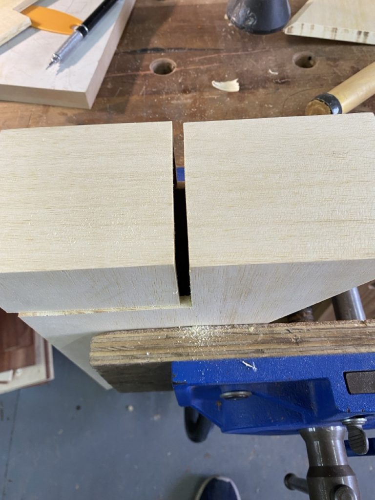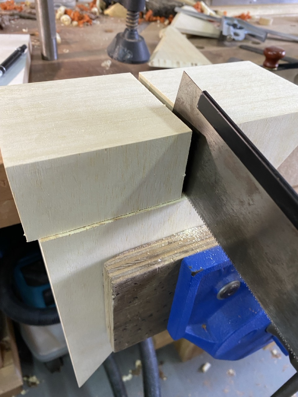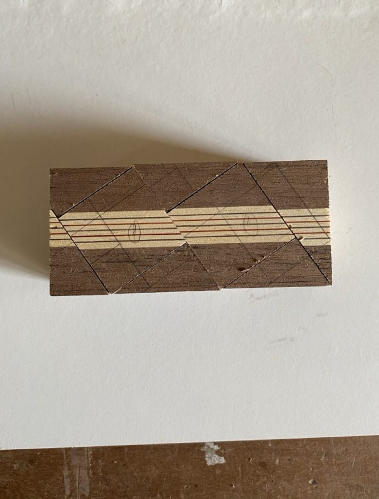 Cuerpo triángulo rectángulo: Uniones en 45º para cerrar el objeto y uniones de caja y espiga para adosarlo al casillero del cajón.