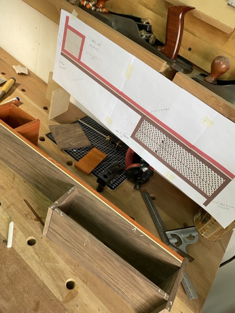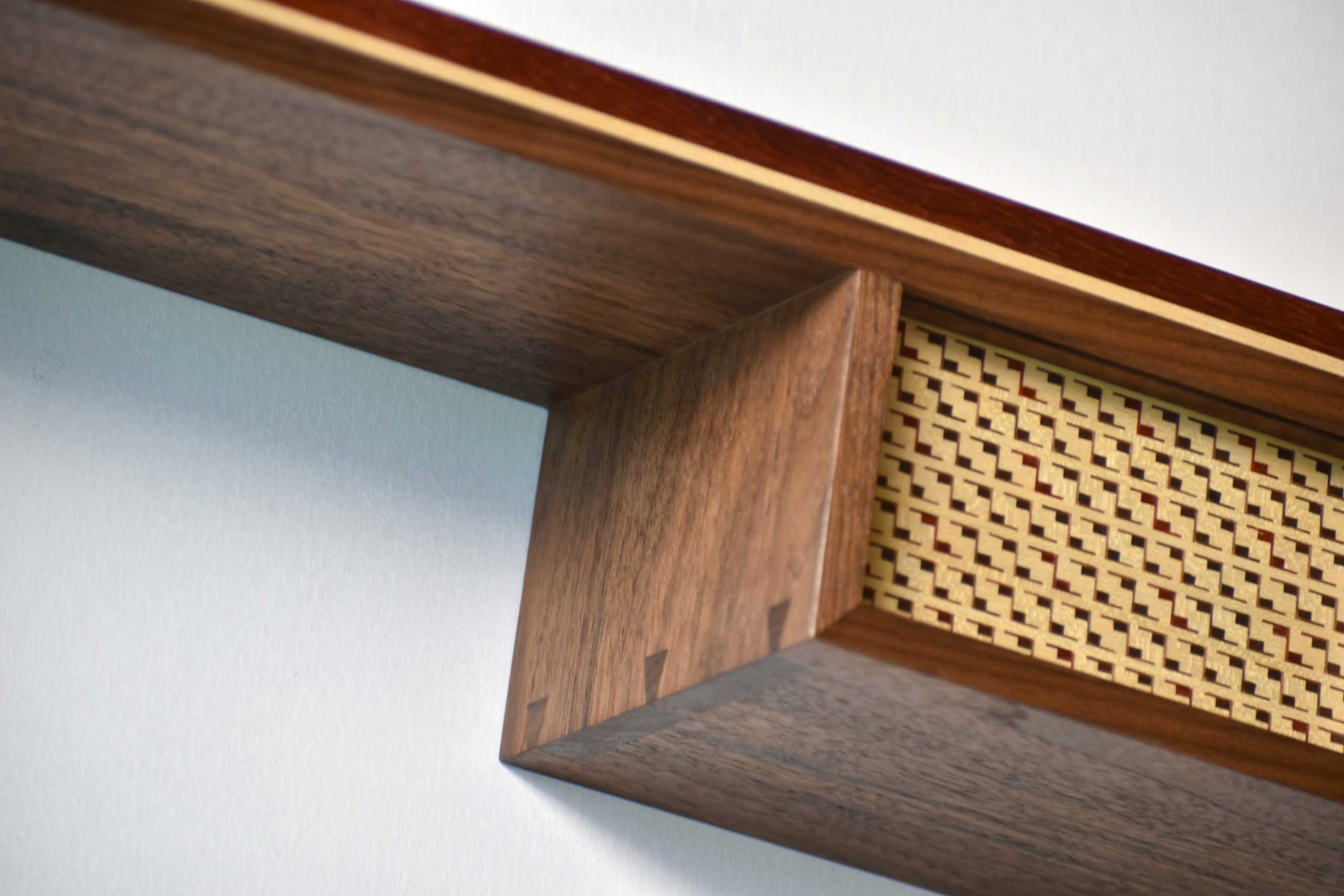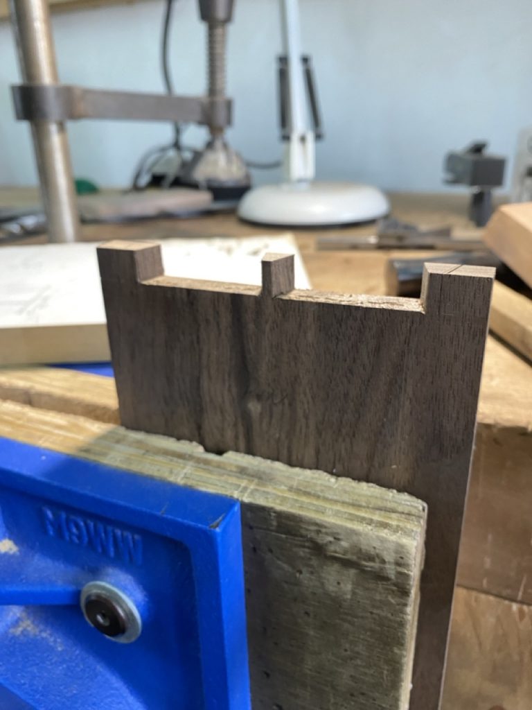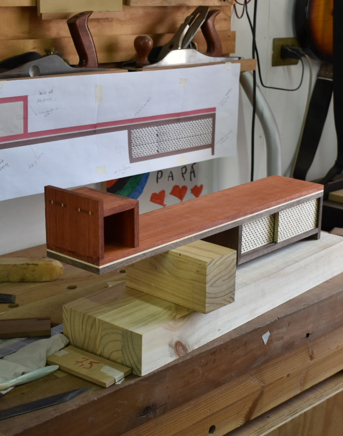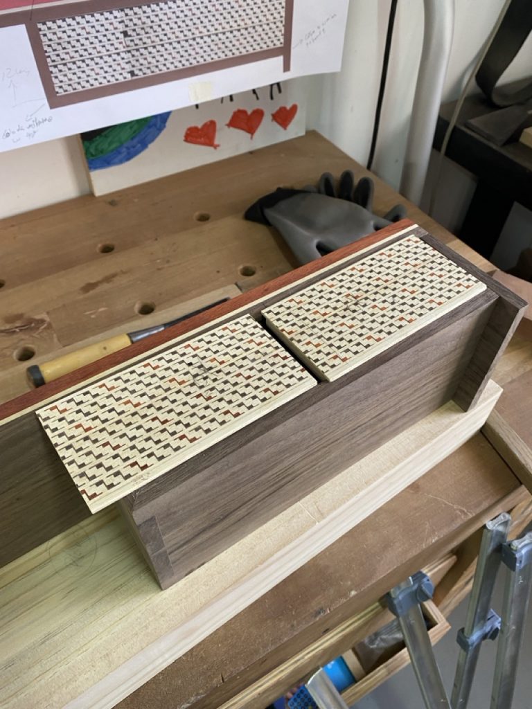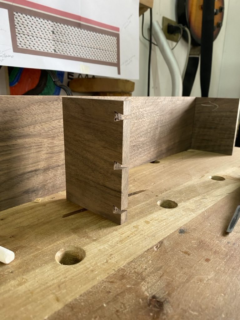 Cuerpo: Uniones de cajas y espigas pasantes con cuñas y colas de milano para los casilleros. Unión de cajas y espigas para adosar los casilleros al travesaño central.