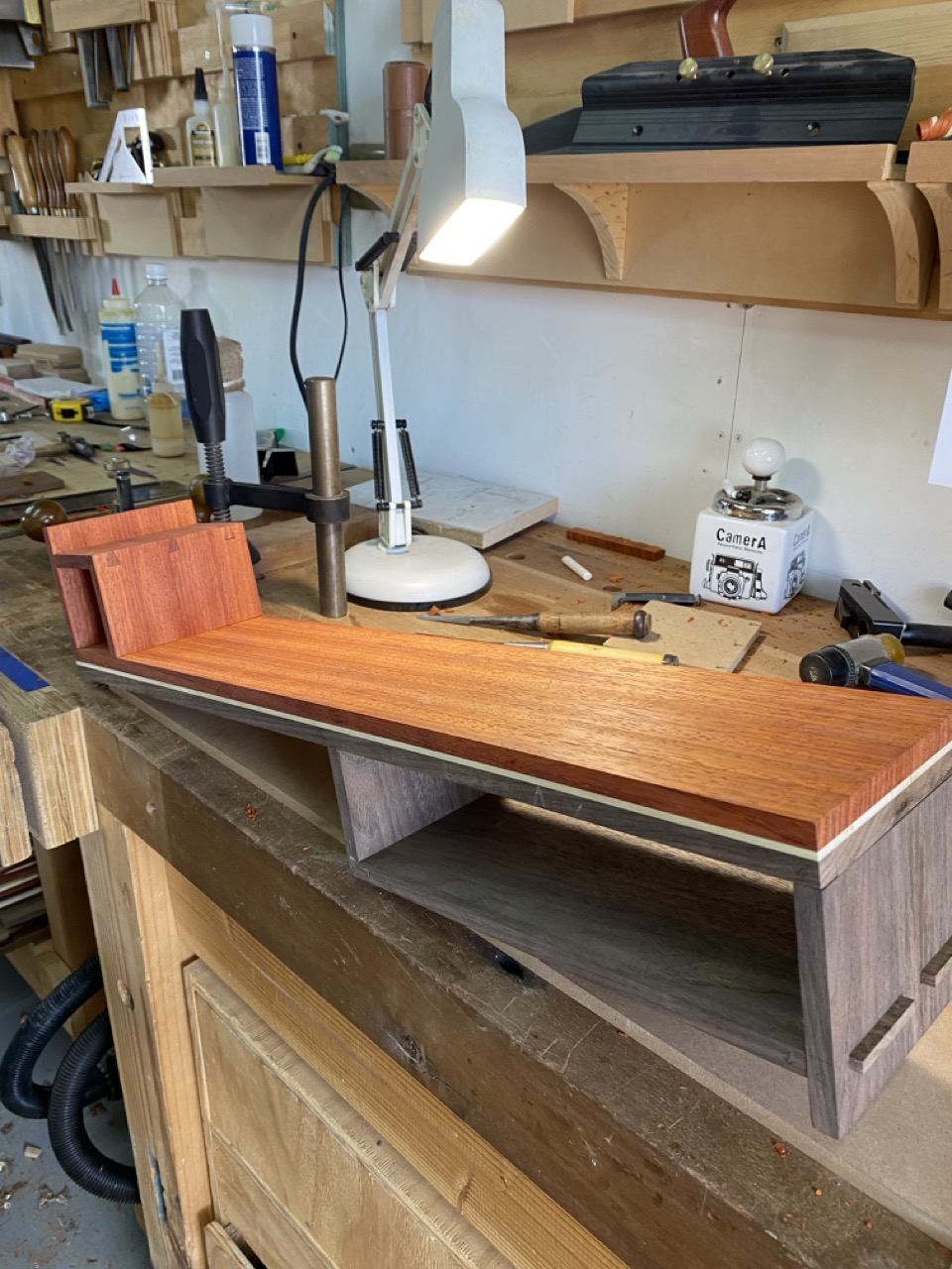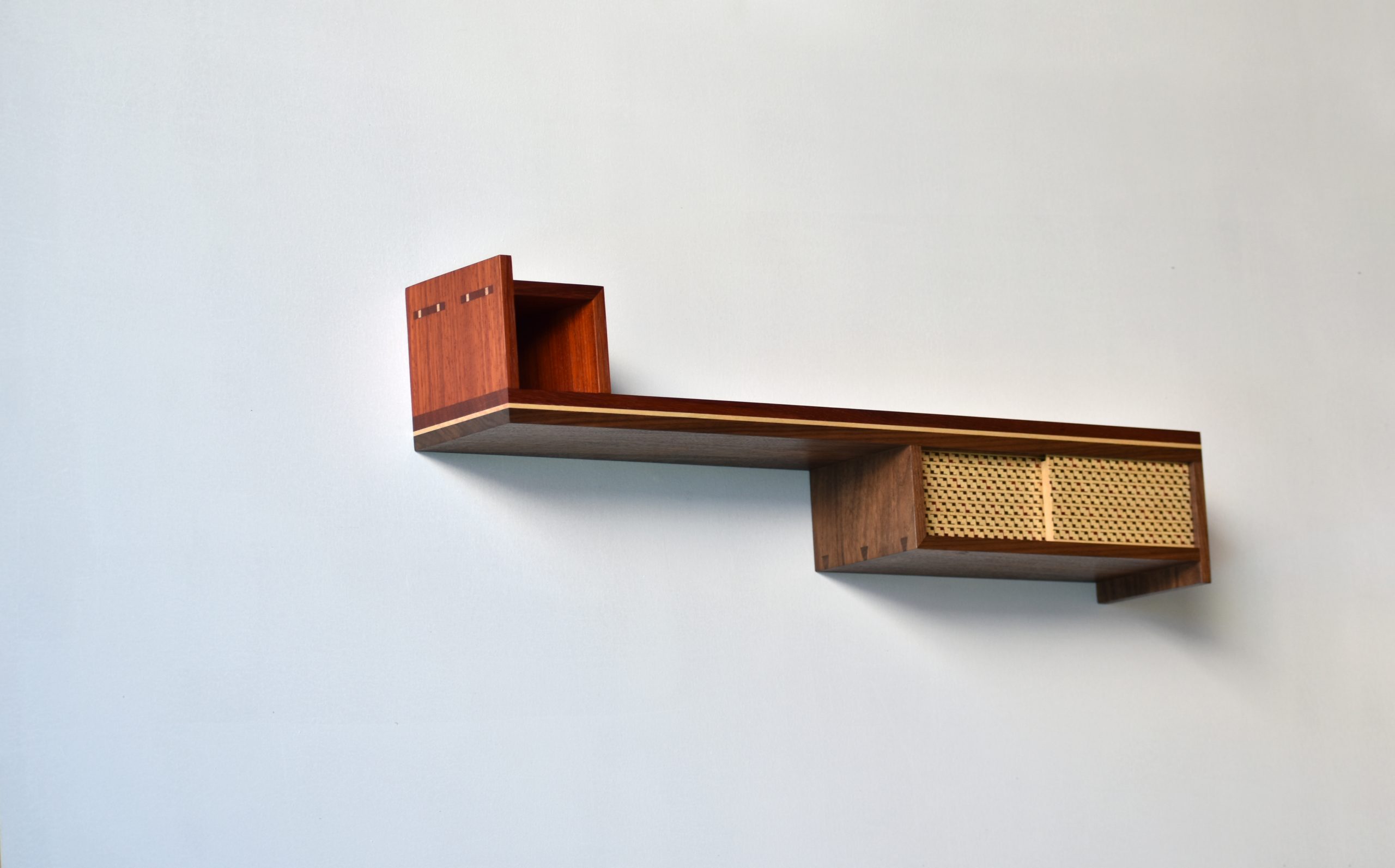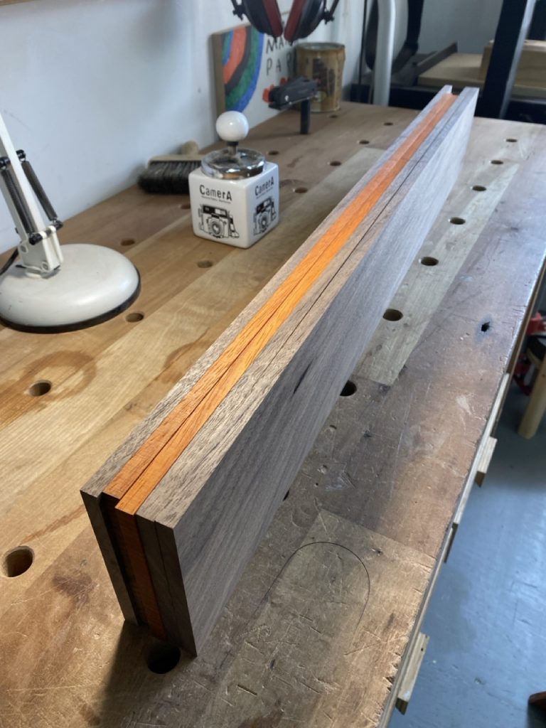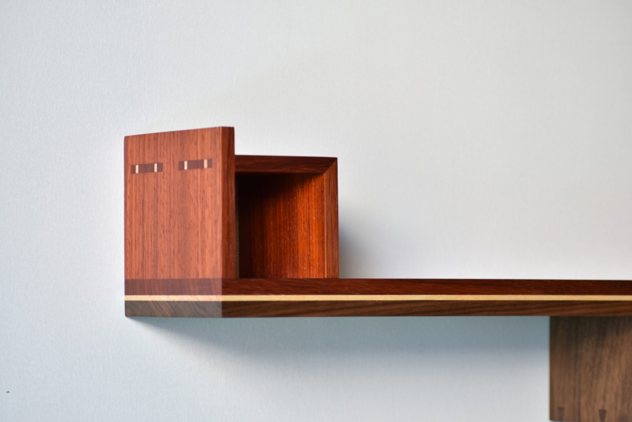 Cuerpo: Uniones de cajas y espigas pasantes con cuñas y colas de milano para los casilleros. Unión de cajas y espigas para adosar los casilleros al travesaño central.