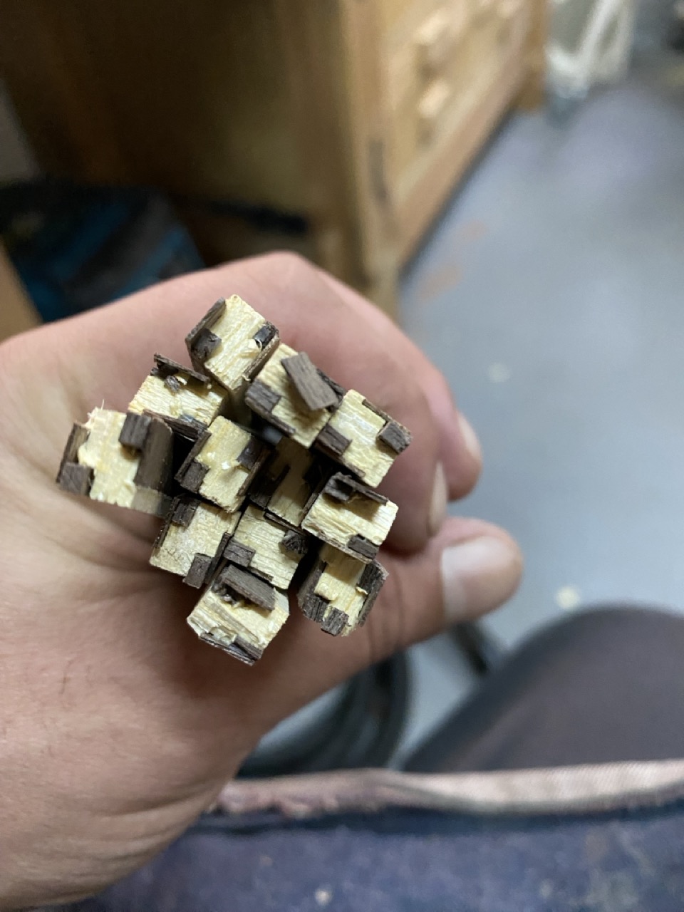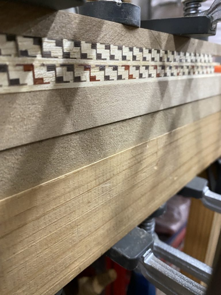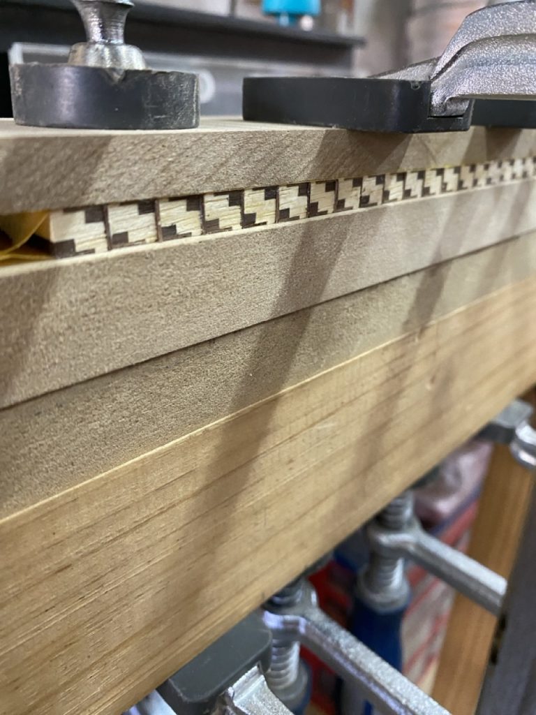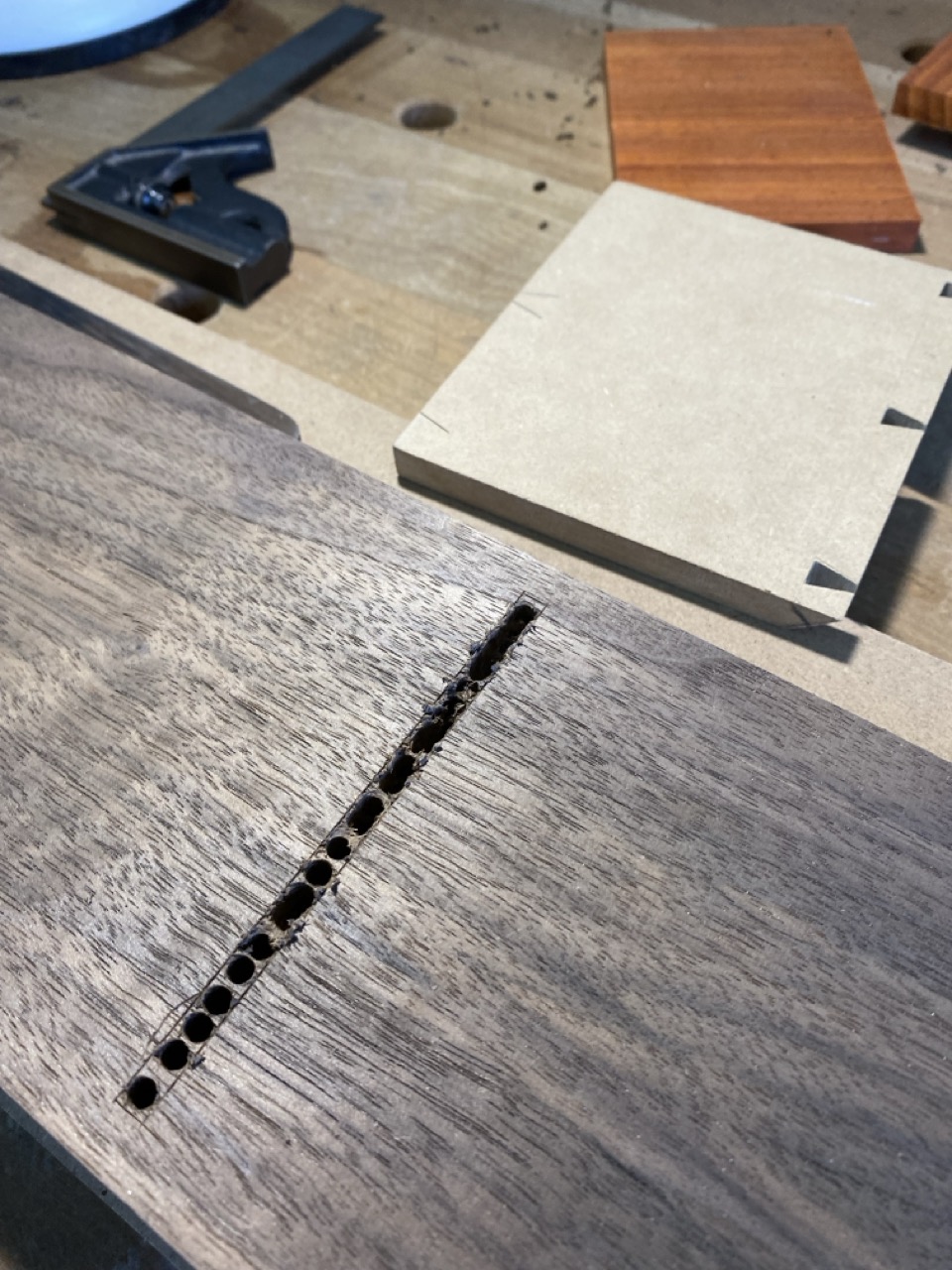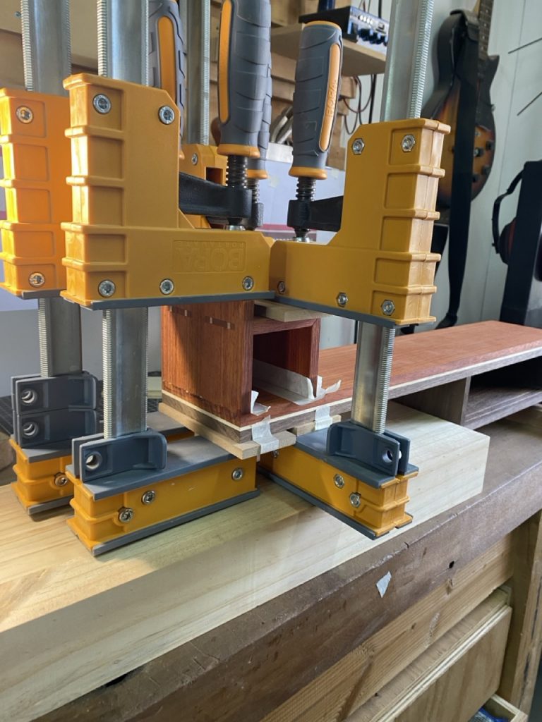 Cuerpo: Uniones de cajas y espigas pasantes con cuñas y colas de milano para los casilleros. Unión de cajas y espigas para adosar los casilleros al travesaño central.