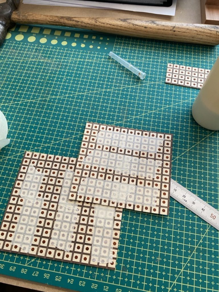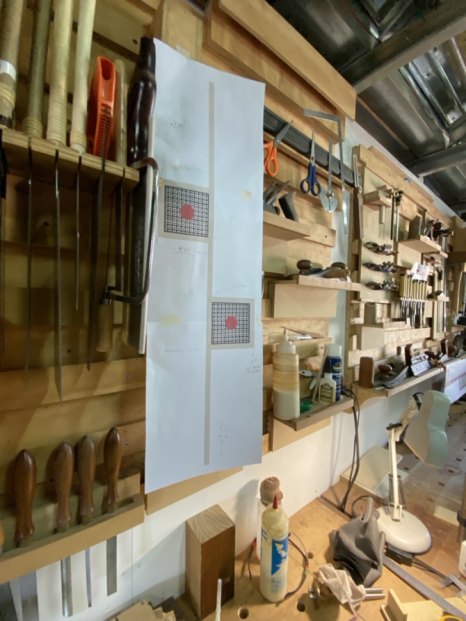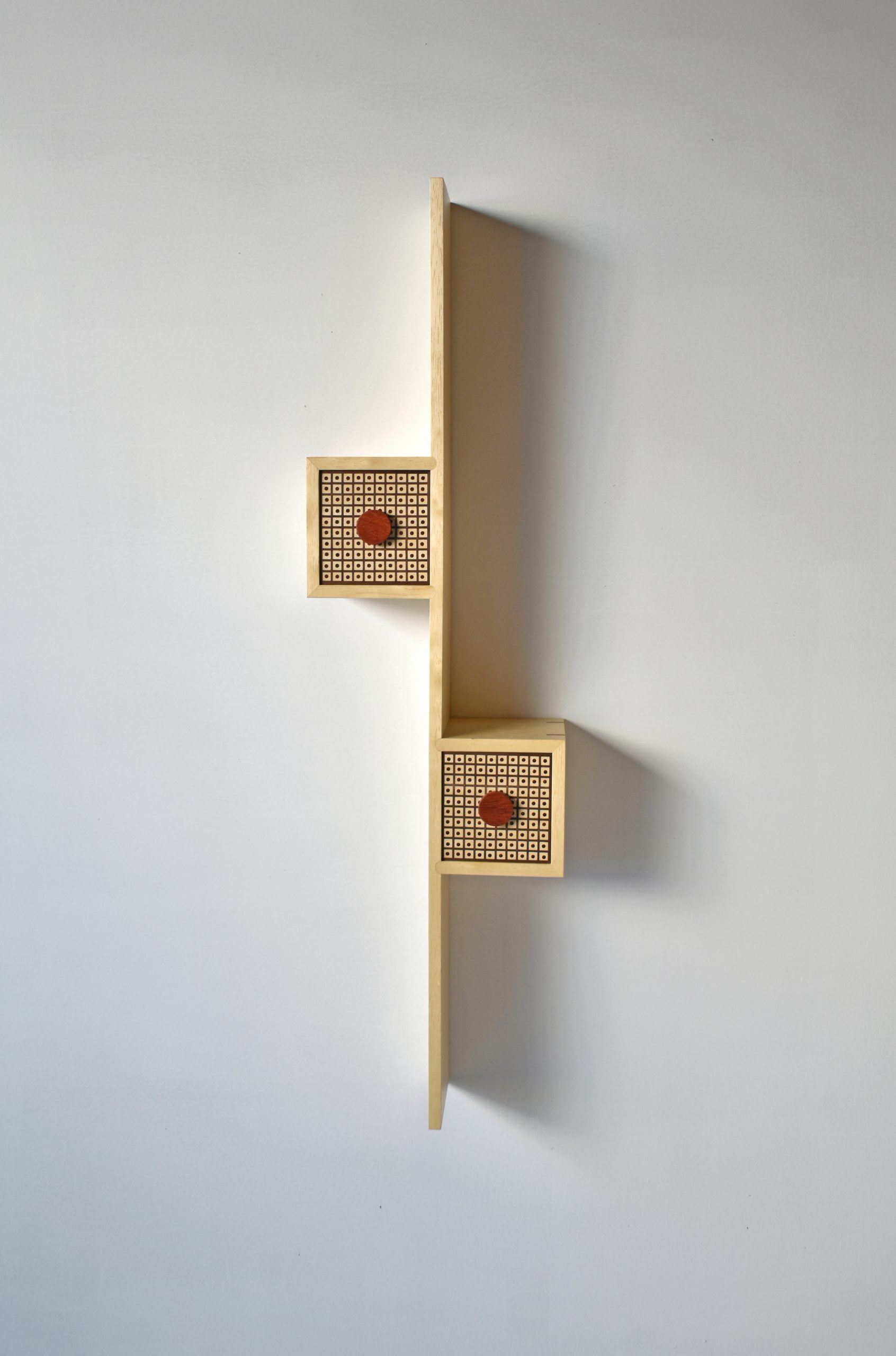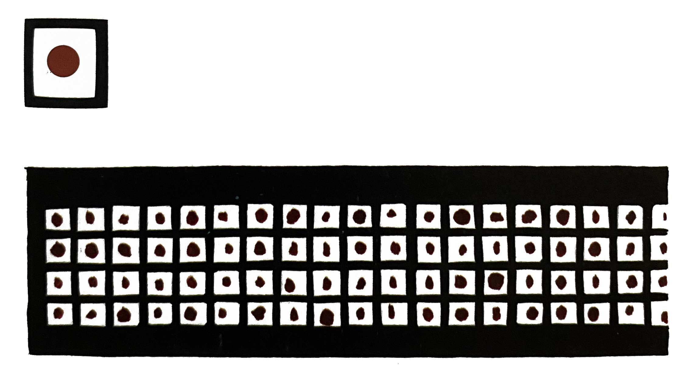 En este diseño la unidad mínima es un cuadrado negro sobre fondo blanco decorado con un círculo rojo en su interior, que se desplaza dentro de un diseño reticulado perpendicular siguiendo el principio de traslación horizontal y vertical. Se distinguen cuatro unidades mínimas alineadas horizontalmente, que se repiten 17 veces en sentido vertical.