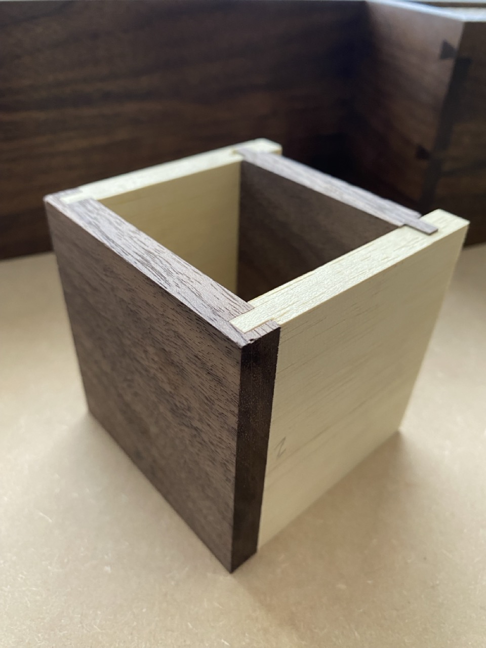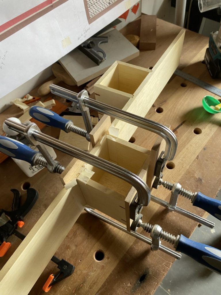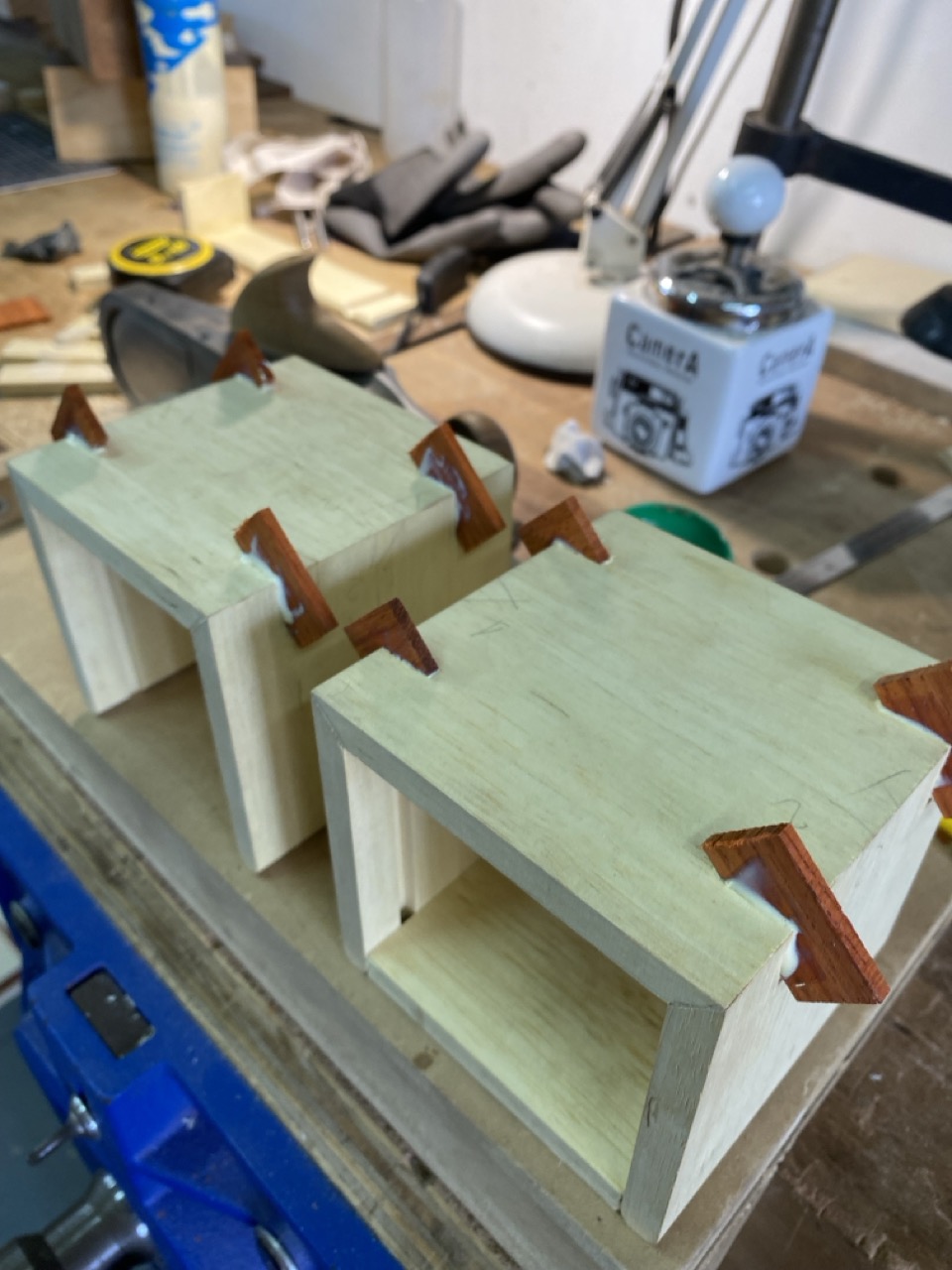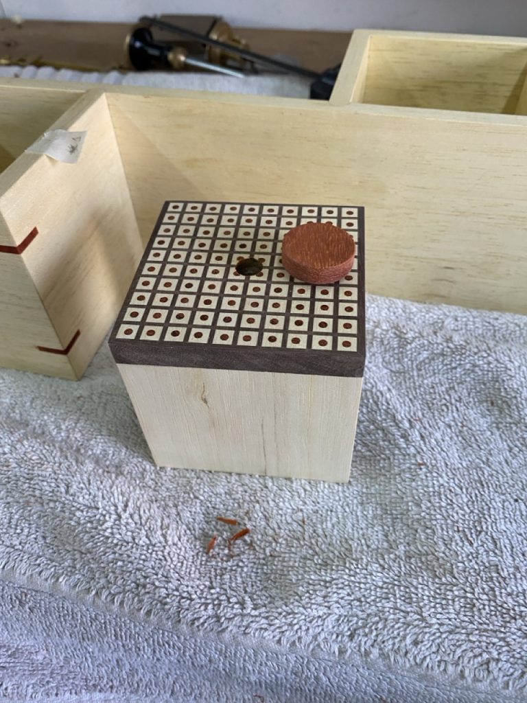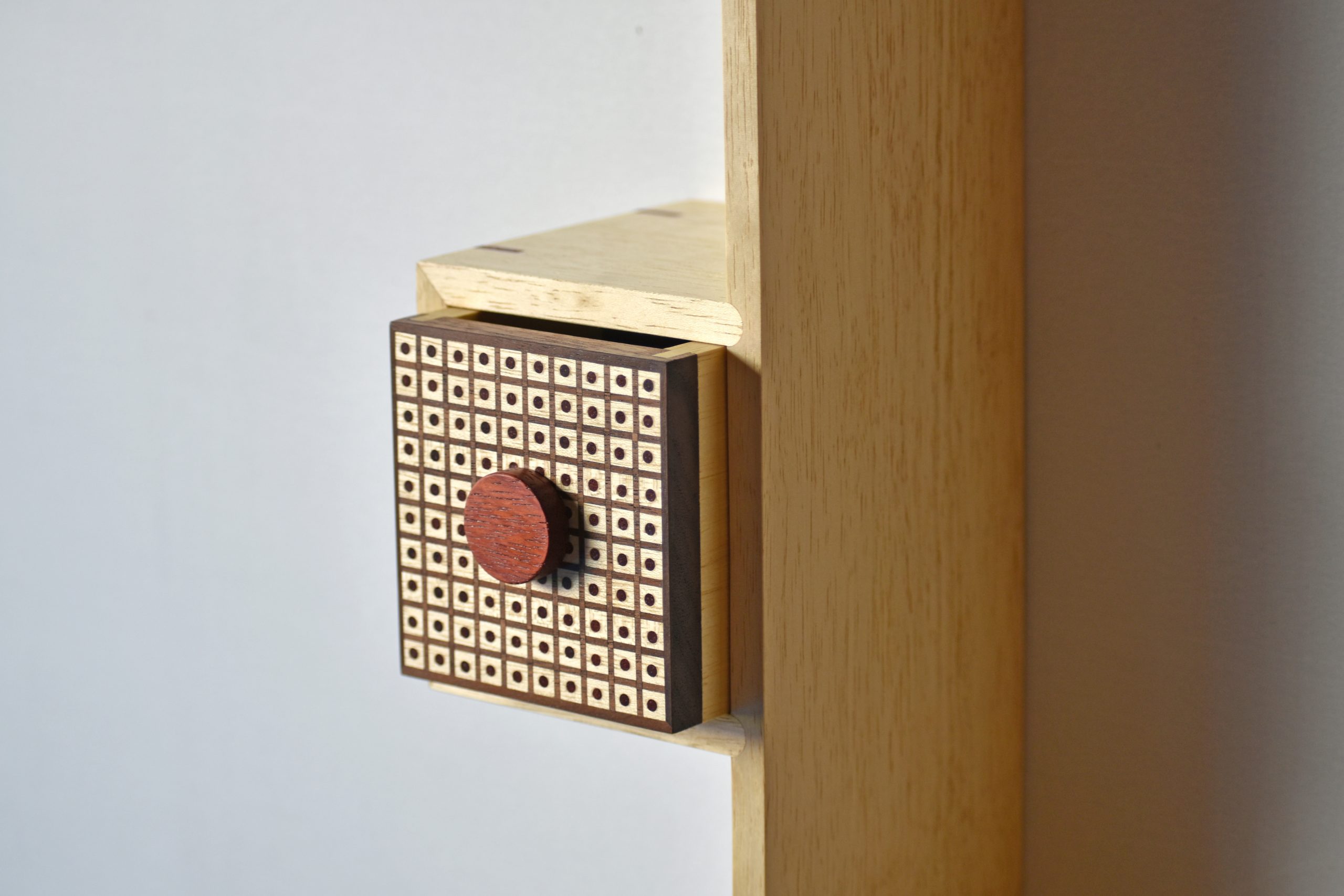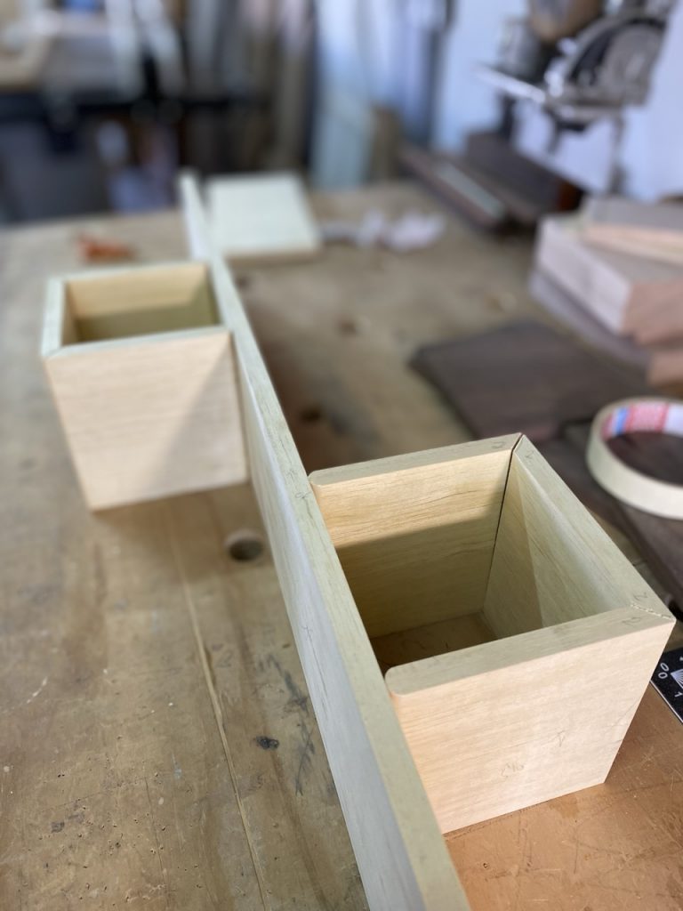 Cuerpo: Uniones de tope en 45º para las esquinas de los casilleros de los cajones con refuerzos de insertos, caja y espiga deslizante para la unión de los casilleros a la madera vertical central del objeto.