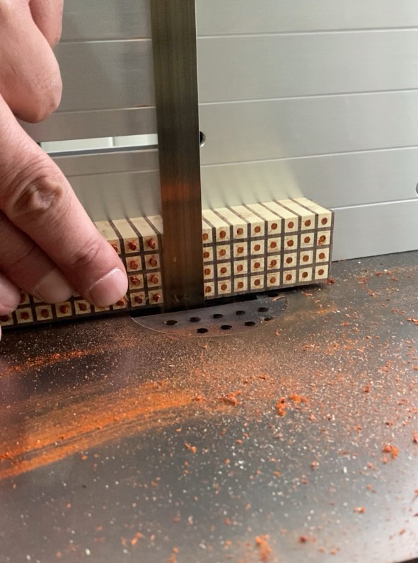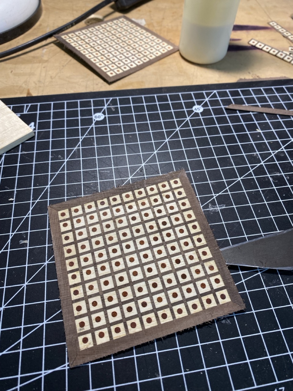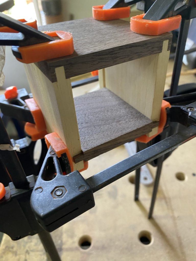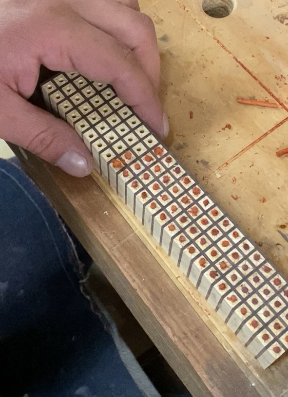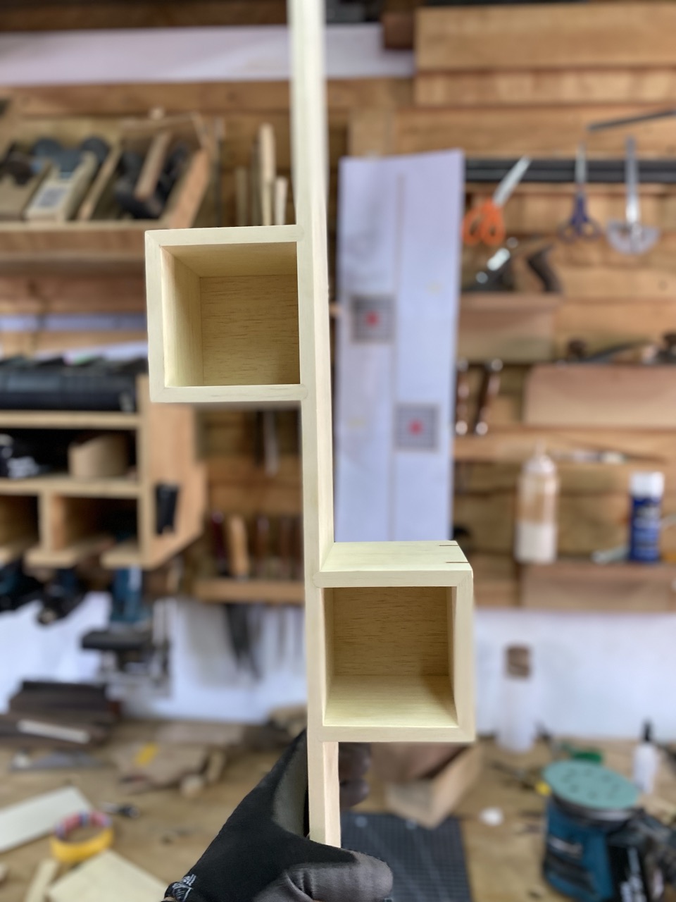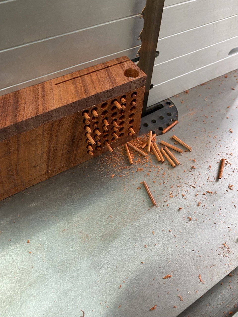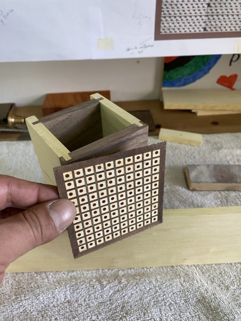 Cuerpo: Uniones de tope en 45º para las esquinas de los casilleros de los cajones con refuerzos de insertos, caja y espiga deslizante para la unión de los casilleros a la madera vertical central del objeto.