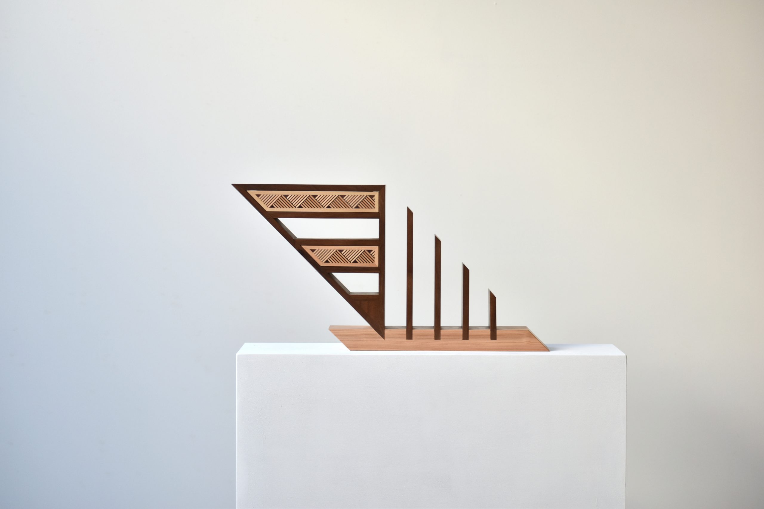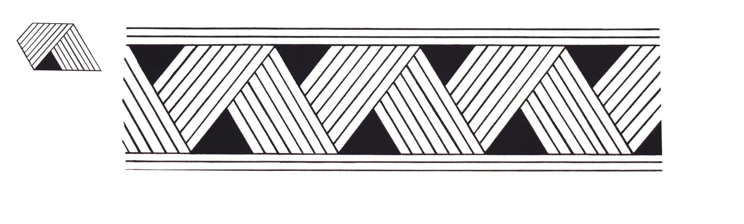 En esta subvariante la unidad mínima es una figura semi triangular compuesta por dos bandas blancas oblicuas y sobrepuestas en cuyo interior se dibujaron una serie de líneas paralelas oblicuas coincidentes con uno de sus bordes laterales, sobre fondo negro.