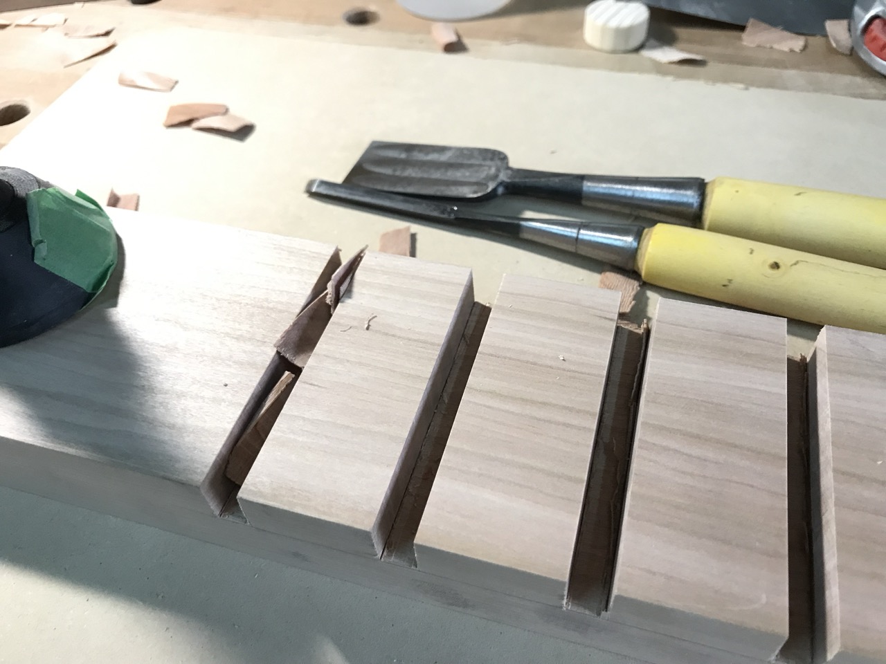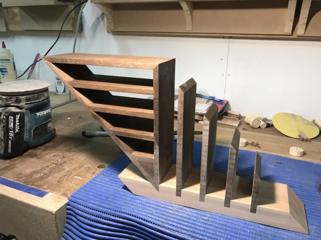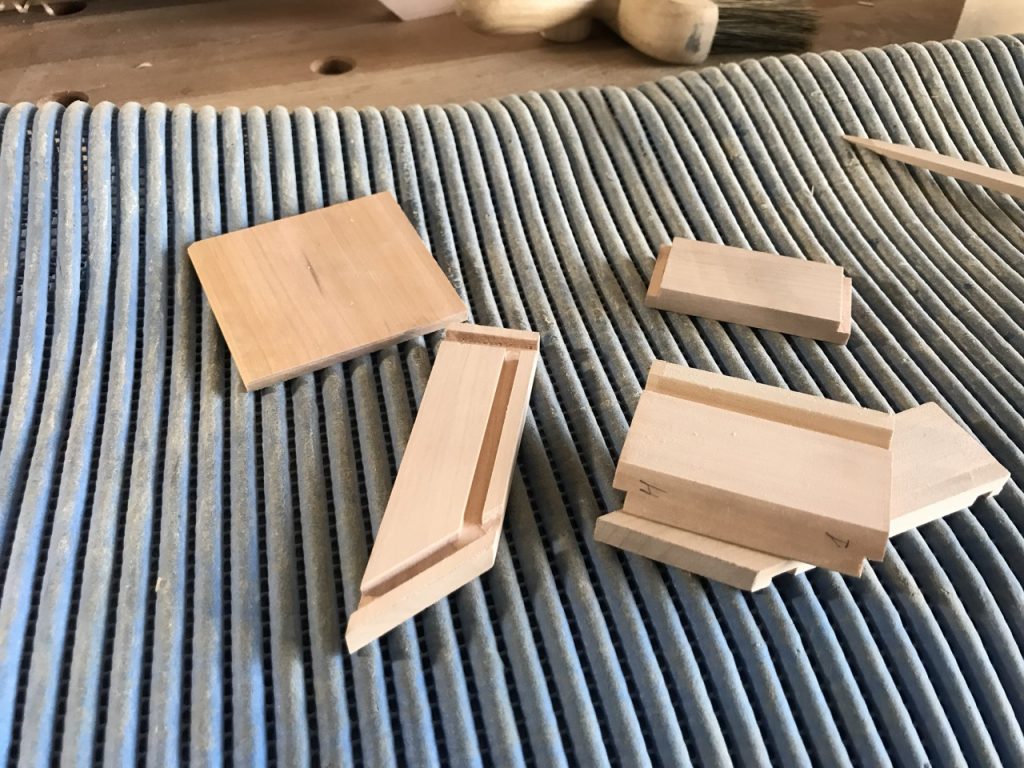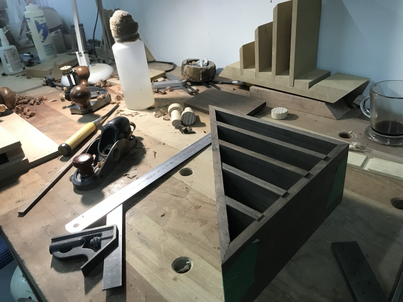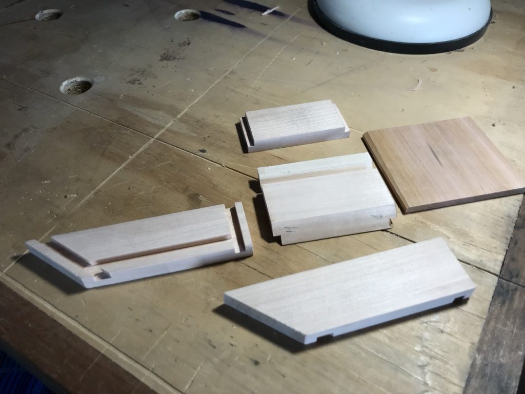 Cuerpo triángulo rectángulo: Uniones en angulo y refuerzos de insertos para las esquinas superiores, cajas y espigas para los listones divisores de los cajones y caja para la union del cuerpo a la base.